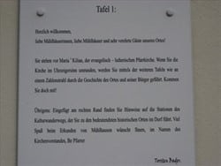 Ein pfiffiger Zusatzeffekt ist: die Tafeln stellen ja die Geschichte Mühlhausens chronologisch, also entlang der Jahreszahlen, vor. Wenn in der Geschichte etwas erwähnt wird, was sich in Mühlhausen wiederfinden lässt (Kulturwanderweg der Dorferneuerung), so ist drauf in blauer Schrift am rechten Tafelrand verwiesen. So wird die Mühle, die Synagoge, das Schloss, die Lochquellen usw. hingewiesen und eine Verbindung von Geschichte (Geschichtsweg) zu heute (Kulturwanderweg) geschaffen.