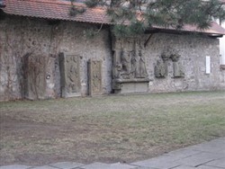 ….das sind einige Tafeln, die an der Westfassade der Kirche beginnen (zum Denkmal hin). Dann geht es im Uhrzeigersinn um die Kirche herum, einige Tafeln befinden sich an der Mauer, wo auch die Grabplatten eingesetzt sind, dann geht’s an der Bücherei weiter und die letzte Tafel ist neben dem Schaukasten.